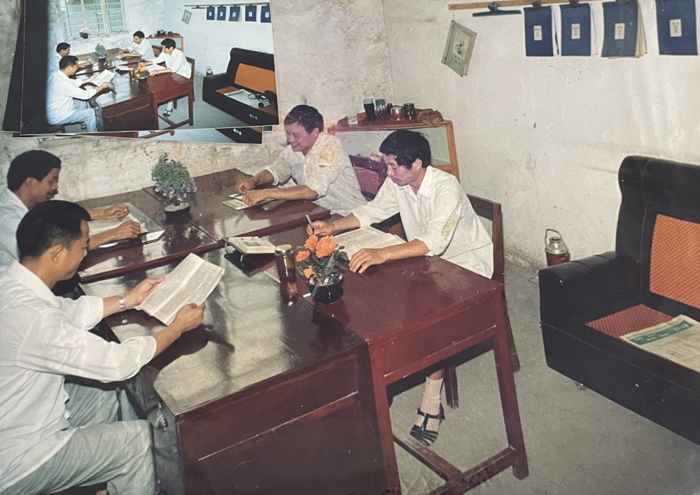▲80年代,機關(guān)辦公室工作場景。新舊都不一樣的四張桌子拼成一張大長桌,大家面對面圍坐著辦公。桌面上的兩盆鮮花植物,算是為數(shù)不多的裝飾。