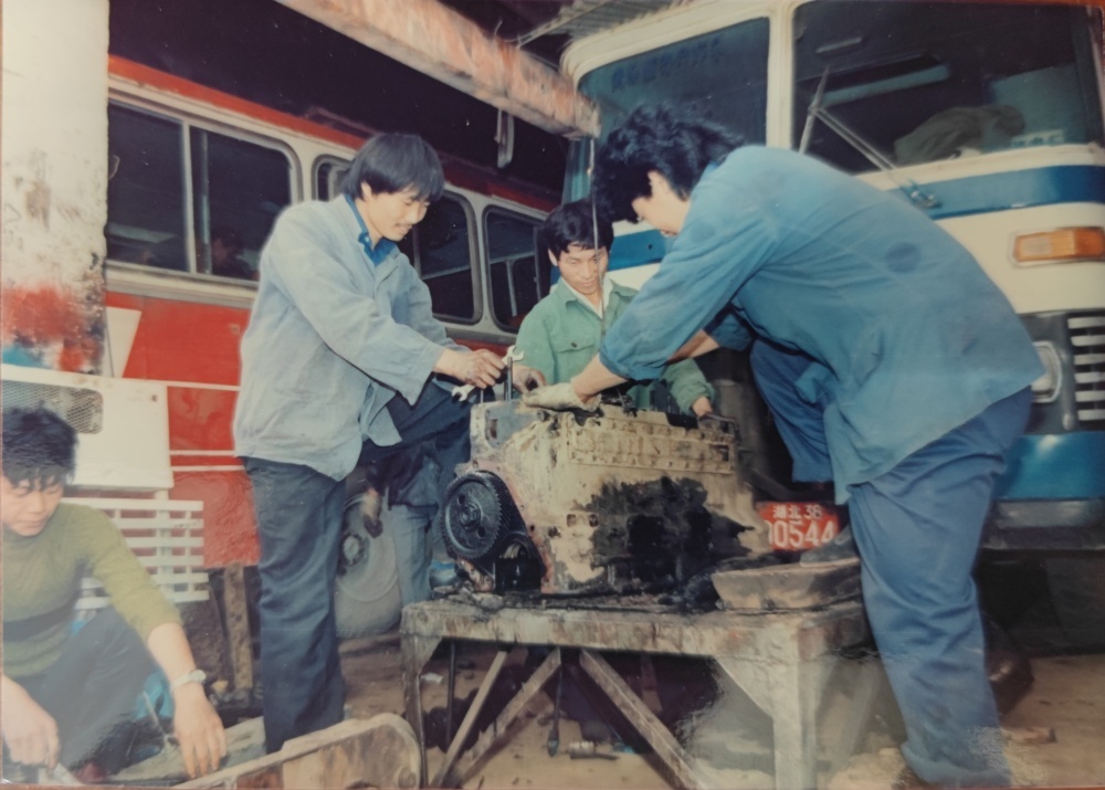 ▲80年代,車間修理工檢修模樣。3個機修工一同修理著車輛發(fā)動機,臉上沒有吃力感,更像是帶著興趣在專研。