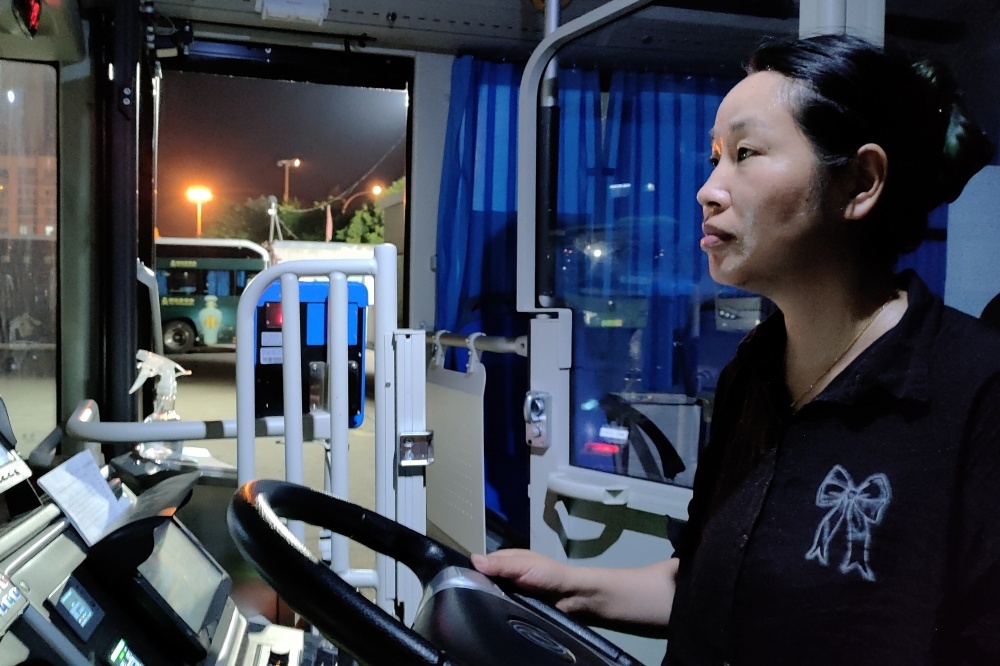 夏夜的停車場很是悶熱,她穿梭于公交車之間熟練地挪動車輛,確保每輛車都能在充電低峰時段把電充滿。