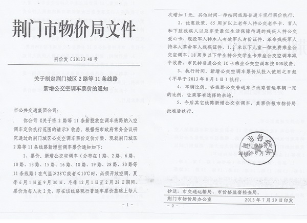 根據(jù)荊門市物價局《關(guān)于制定荊門城區(qū)公交空調(diào)車票價的通知》(荊價發(fā)[2013]46號)及《關(guān)于制定荊門城區(qū)2路等11條線路新增公交空調(diào)車票價的通知》(荊價發(fā)[2013]48號),公交空調(diào)車2014年6月1日至9月30日營運(yùn)時段內(nèi)執(zhí)行2元/人次票價,現(xiàn)就執(zhí)行公交空調(diào)車票價后的有關(guān)事項(xiàng)公告如下: